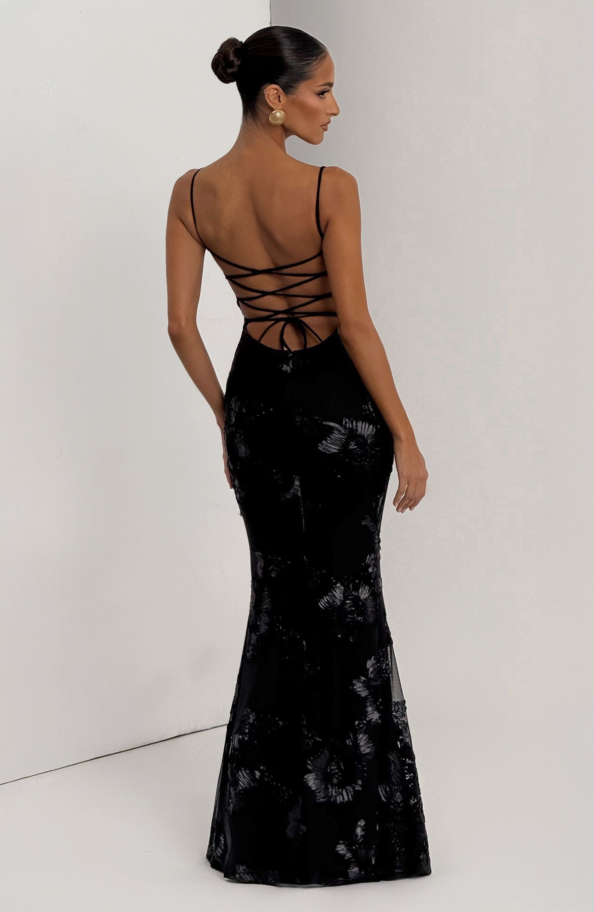De Mirelle Maxi Dress straalt verfijnde elegantie uit met een romantische, sensuele twist. De soepelvallende stof vormt zich prachtig naar het lichaam en creëert een vrouwelijk silhouet met een luxe uitstraling. Florale details geven de jurk diepte en karakter, terwijl de open rug en delicate schouderbandjes zorgen voor een subtiele allure.