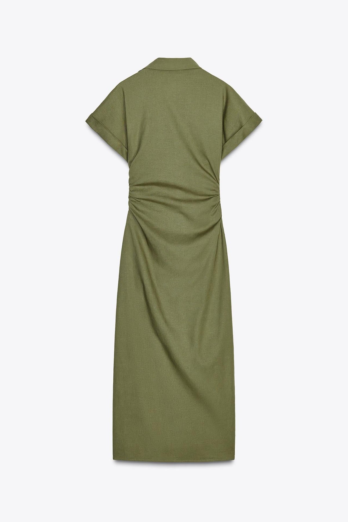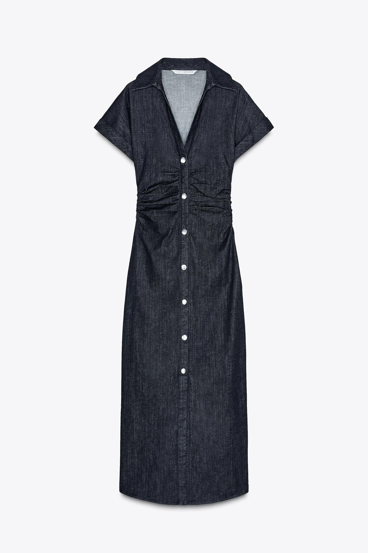 Met een V-hals, reverskraag en korte mouwen met manchet heeft deze jurk een chique uitstraling. De taille met subtiele plooien flatteert je figuur, terwijl de sierknopen en onzichtbare rits zorgen voor een strakke afwerking.