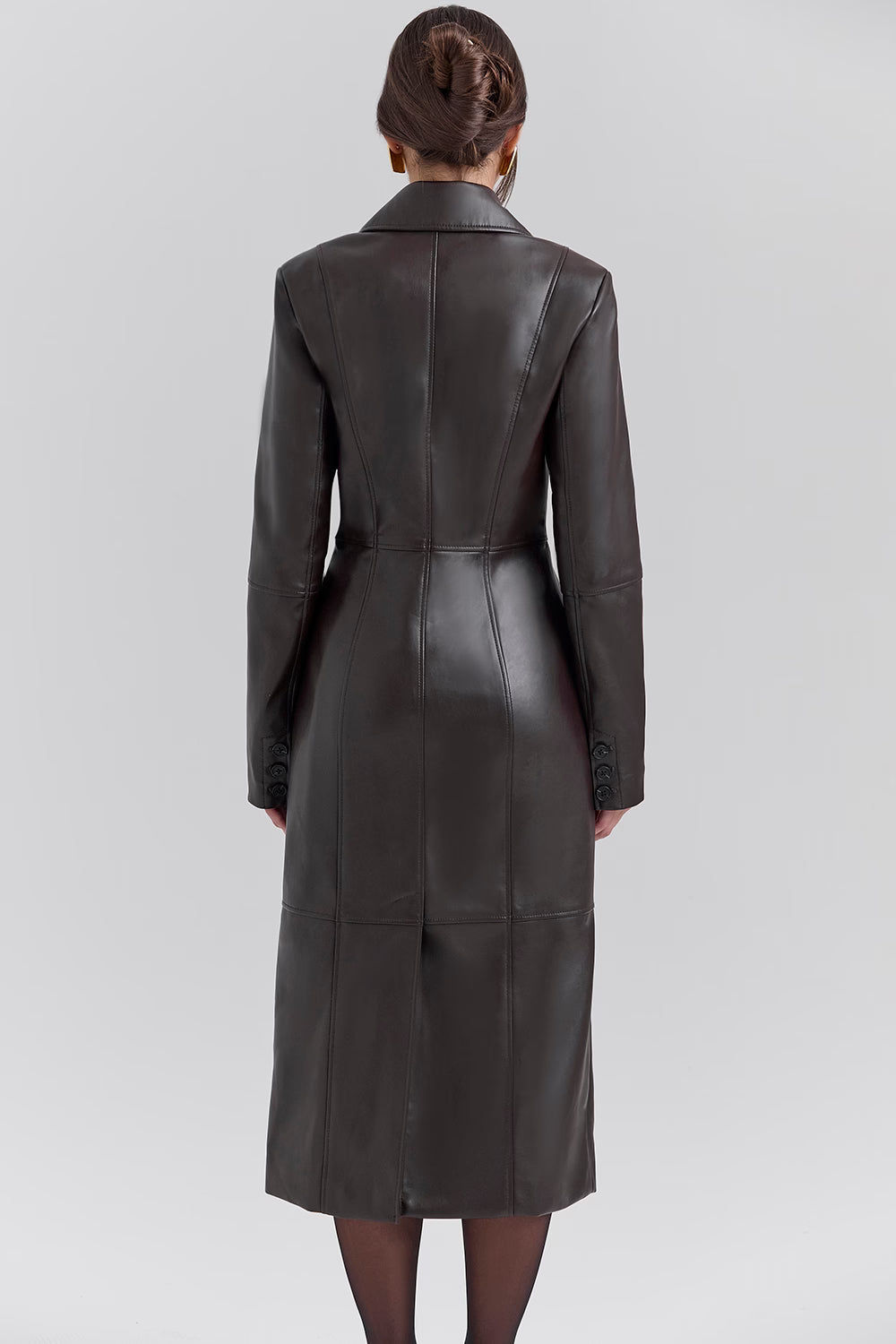De Vegan Leren Jas Loretta staat voor tijdloze elegantie met een moderne uitstraling. Deze slanke longline jas van boterzacht bruin vegan leer heeft een vrouwelijke slim fit, een subtiele A-lijn en een klassieke double-breasted sluiting. Het silhouet valt prachtig over jurken, rokken en tailored broeken voor een moeiteloos verfijnde look.