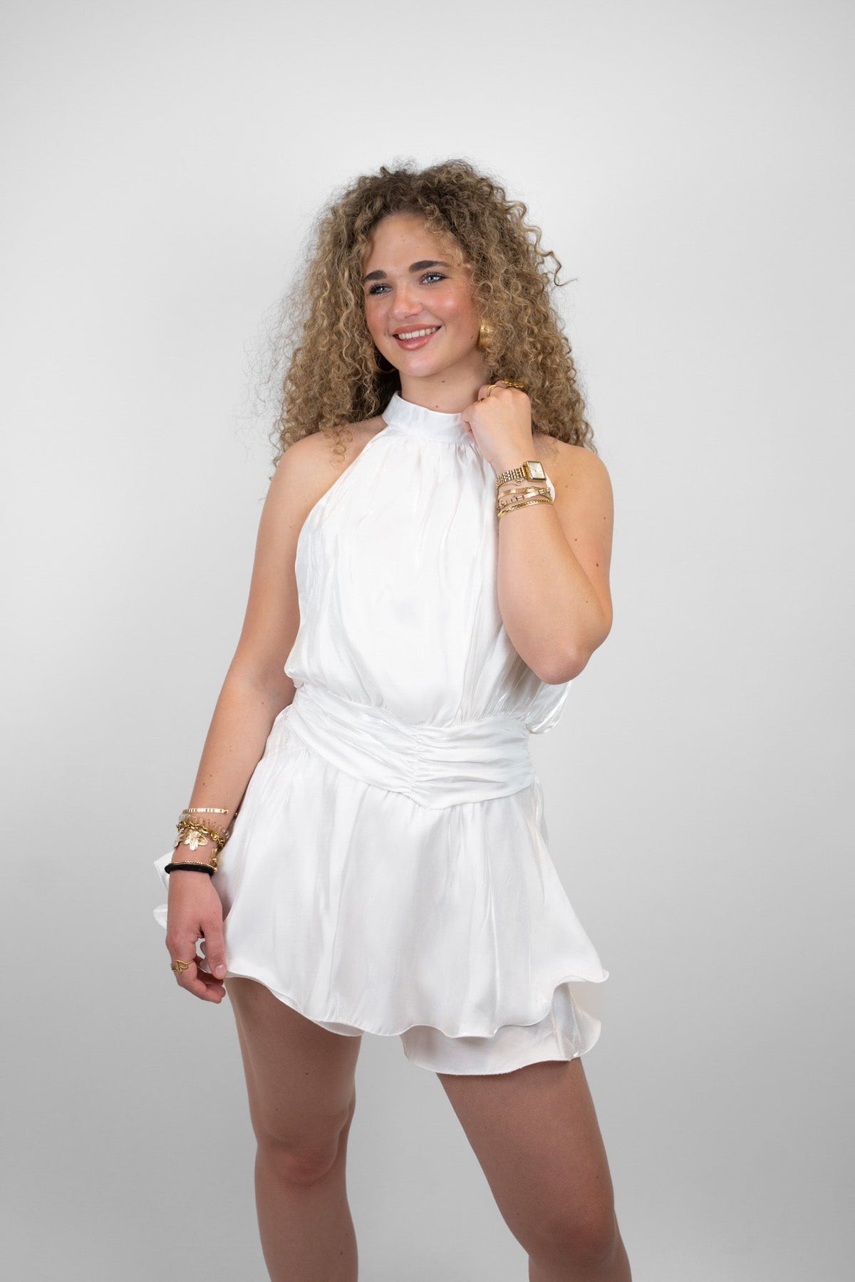Stralend wit en heerlijk luchtig — de Isla Zomerjurk is jouw perfecte zomervriendin. Met een hoge halslijn, een elegante tailleband en zwierige rok straalt deze mini-jurk moeiteloze vakantielook uit. Gemaakt van een glanzende stof met comfortabele stretch in de taille. Draag met gouden sieraden en slippers voor overdag, of met hakjes voor een zomers feestje.